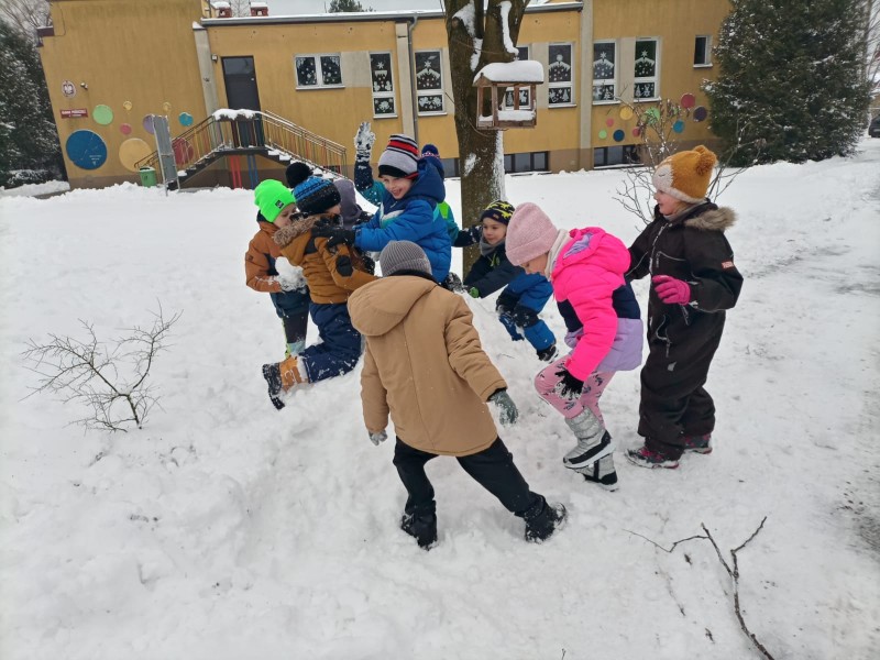 „Jest zima i mocno trzyma”, Biedronki lubią zabawy na śniegu, bo jest zdrowo i wesoło. Starszaki rzucali śnieżkami, lepili śnieżne kule na bałwanki, nawet próbowali ulepić igloo, ślizgali się po lodzie, chodzili po śladach na śniegu a uśmiechy nie schodziły im z twarzy.