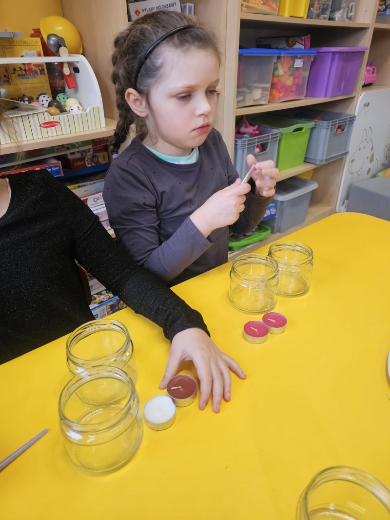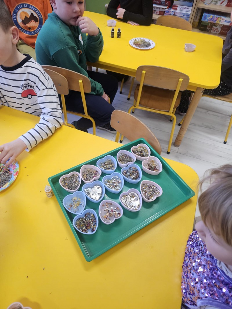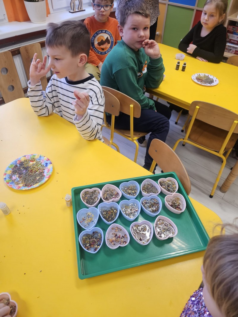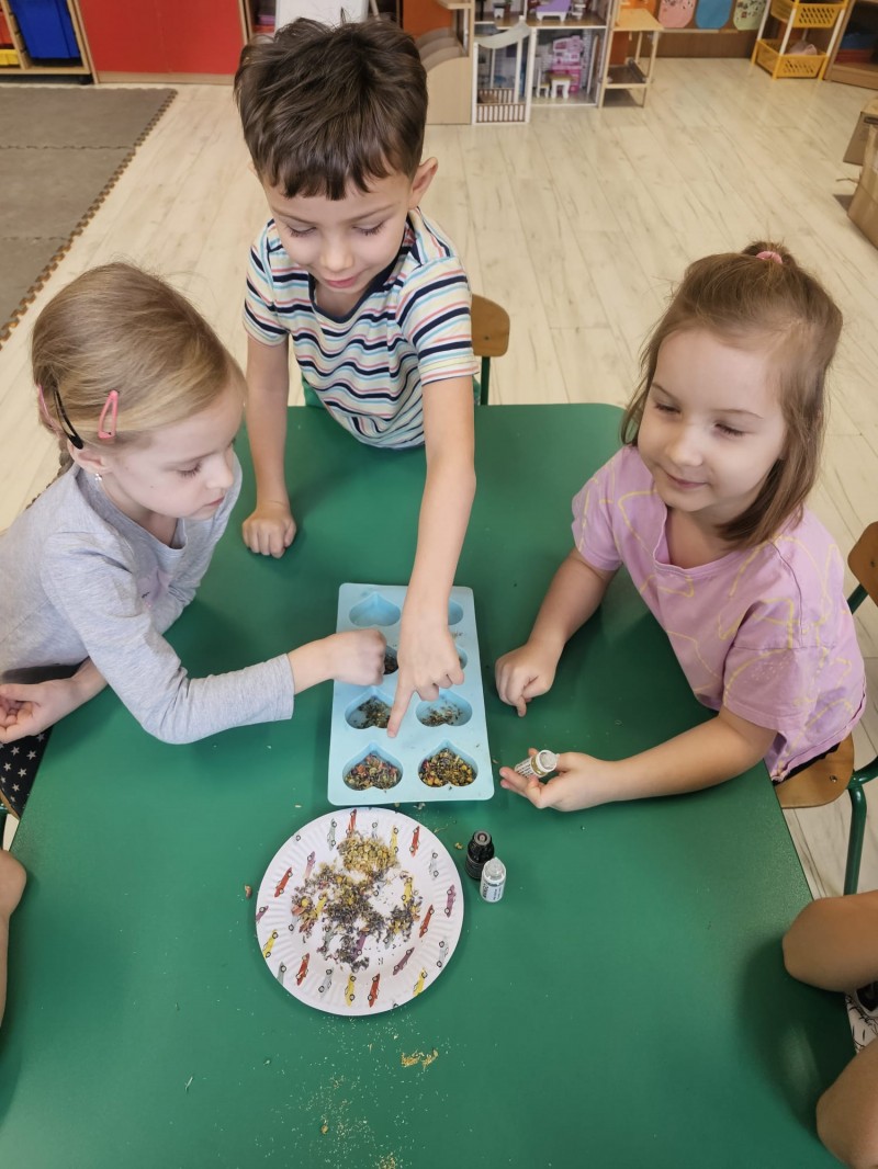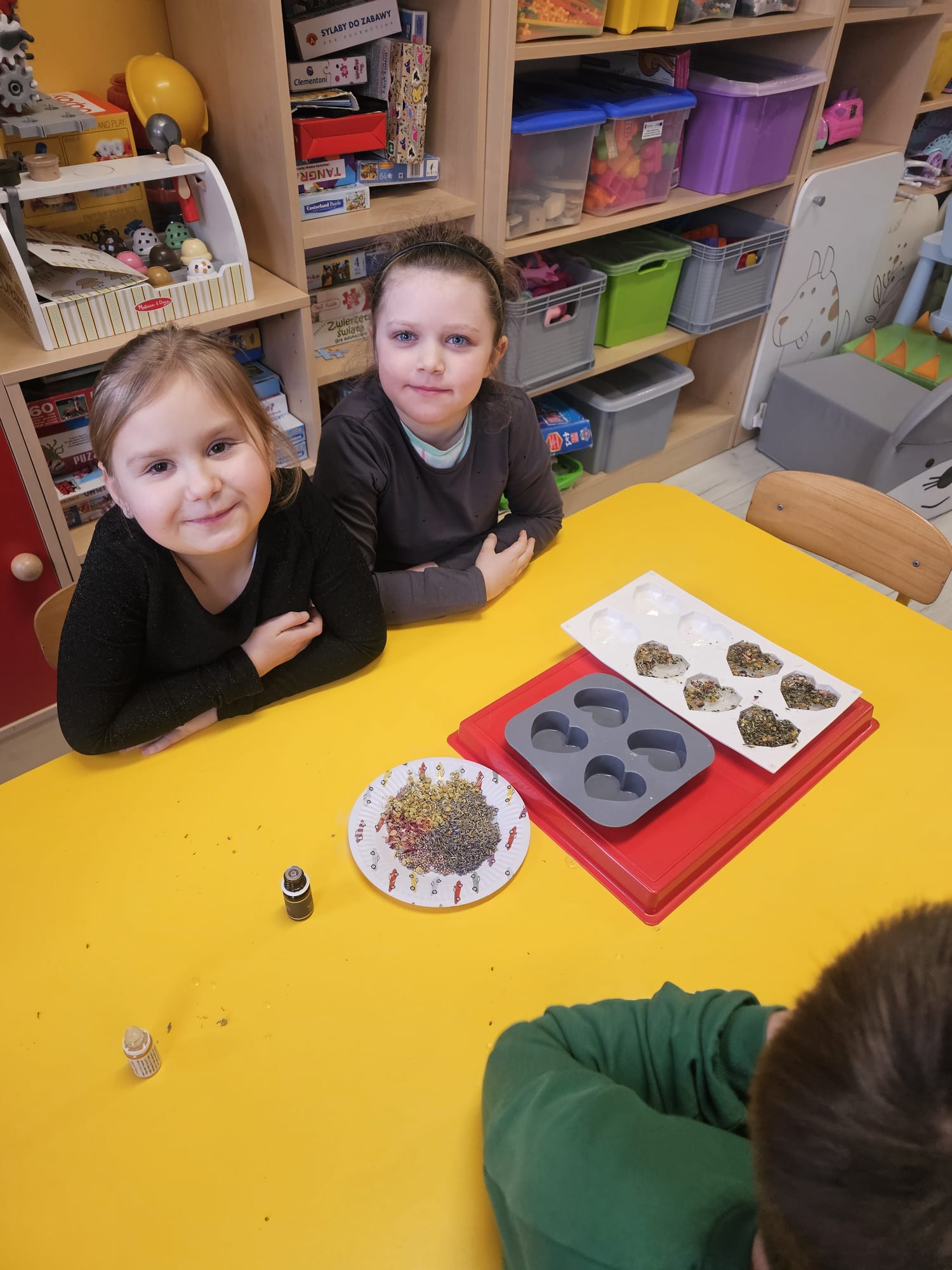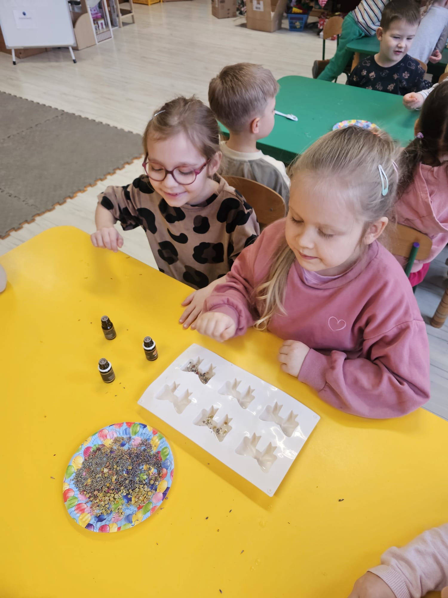 Dzieci z ogromnym entuzjazmem tworzyły własnoręczne, pachnące mydełka oraz piękne świeczniki.Dzieci miały możliwość zobaczyć w jak prosty sposób można wykonać przepiękne mydełko z suszoną lawendą, płatkami róży, rumiankiem lub innymi suszonymi kwiatami czy ziołami.Ależ to był zapach! Była to nie tylko świetna zabawa, ale także doskonała okazja do rozwijania kreatywności, zdolności manualnych i wspólnego spędzania czasu. To także dowód bardzo dobrej współpracy naszej grupy z rodzicami.