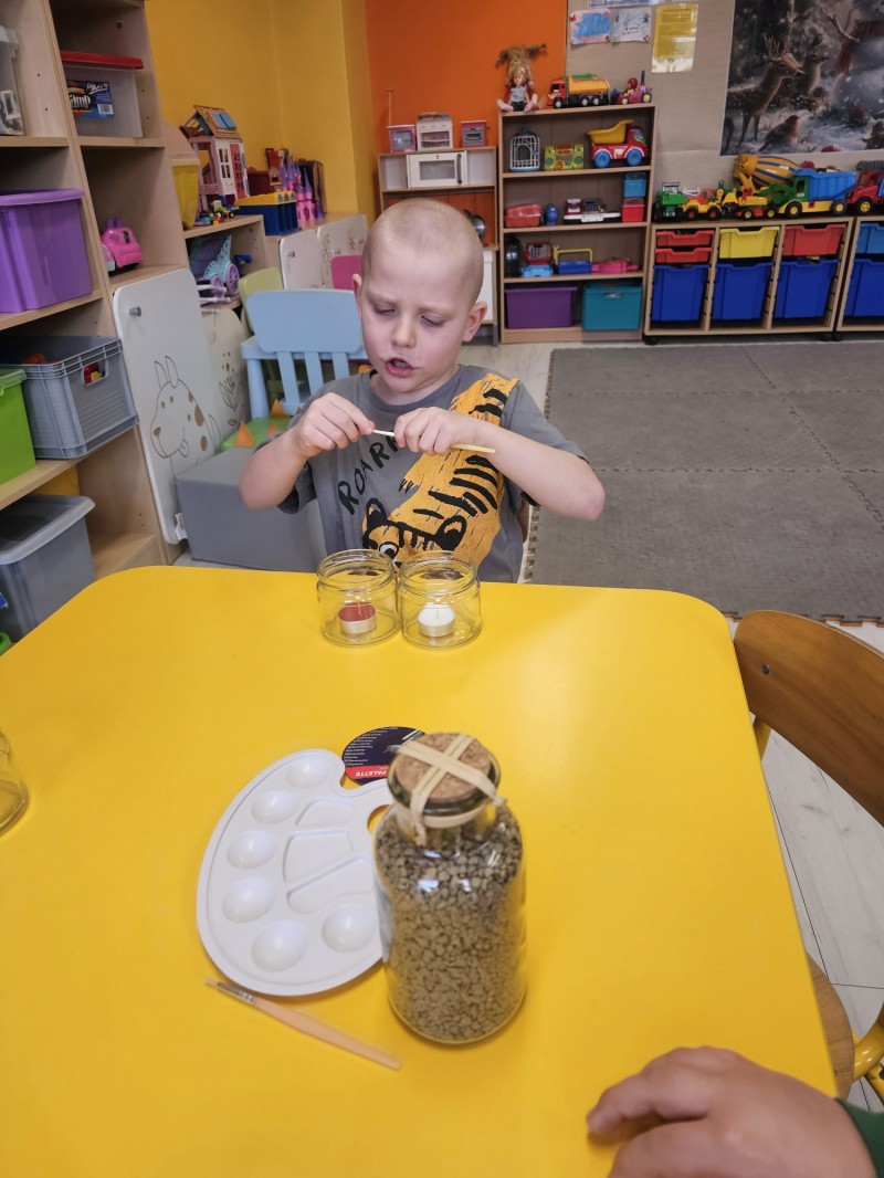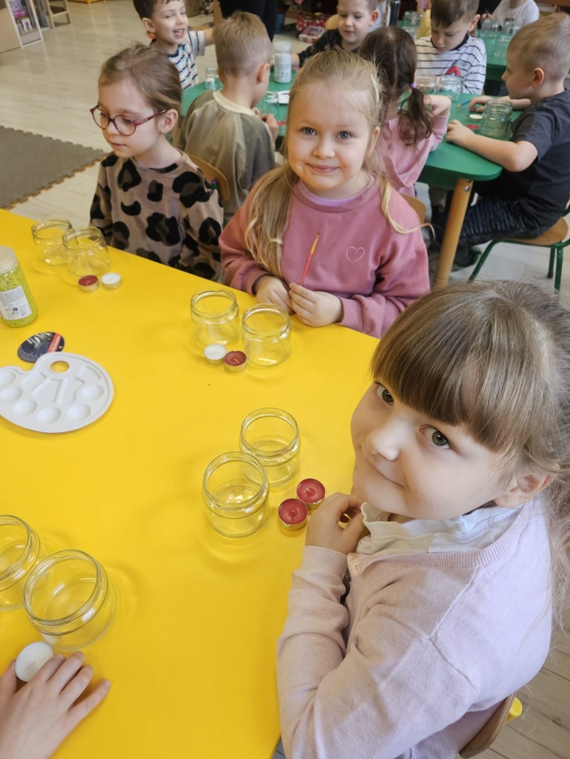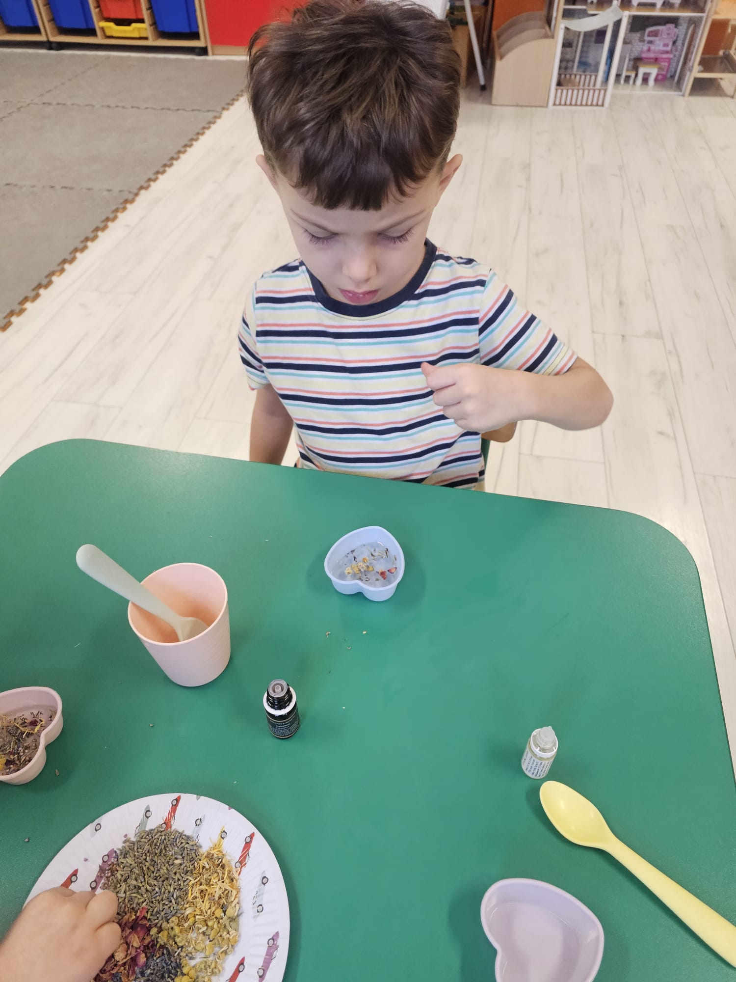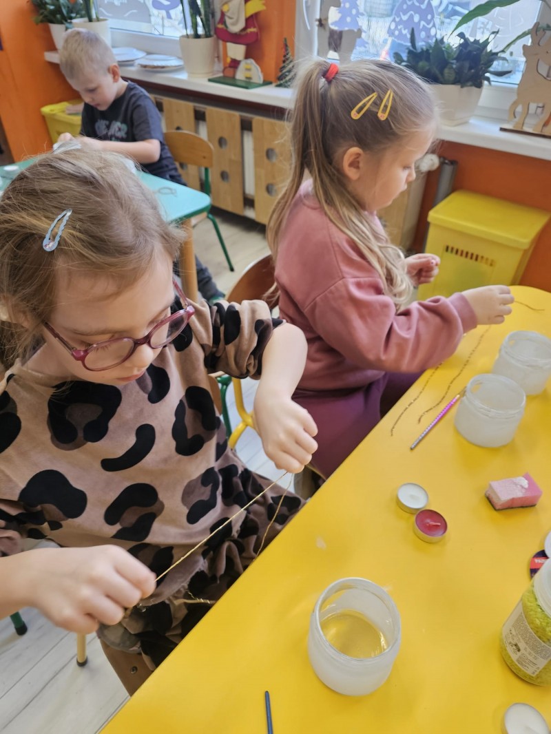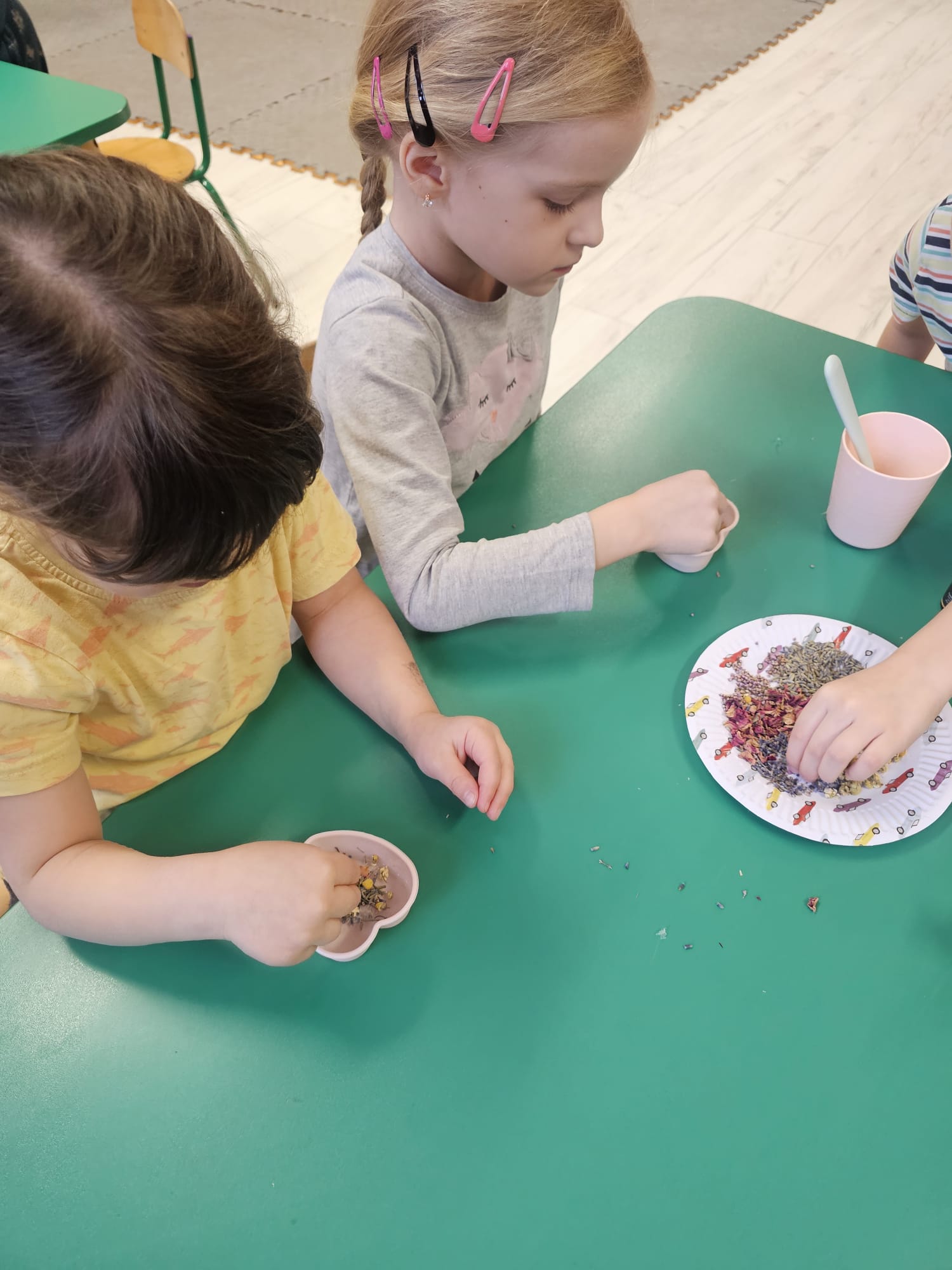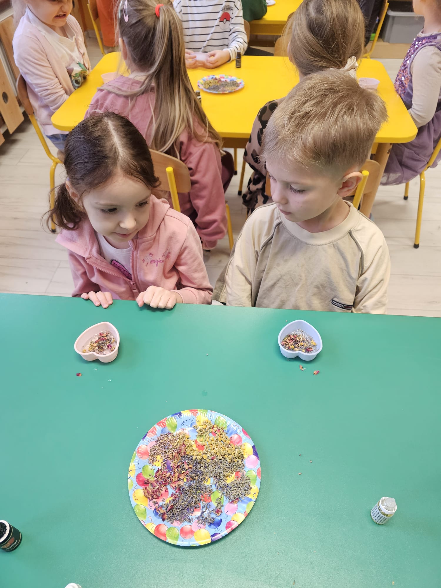 Dzieci z ogromnym entuzjazmem tworzyły własnoręczne, pachnące mydełka oraz piękne świeczniki.Dzieci miały możliwość zobaczyć w jak prosty sposób można wykonać przepiękne mydełko z suszoną lawendą, płatkami róży, rumiankiem lub innymi suszonymi kwiatami czy ziołami.Ależ to był zapach! Była to nie tylko świetna zabawa, ale także doskonała okazja do rozwijania kreatywności, zdolności manualnych i wspólnego spędzania czasu. To także dowód bardzo dobrej współpracy naszej grupy z rodzicami.