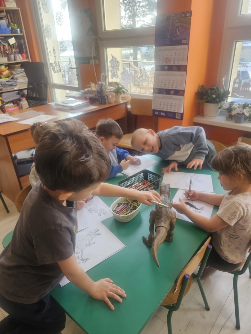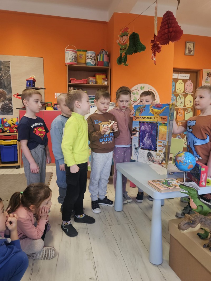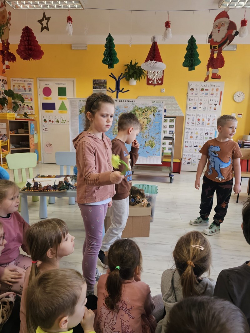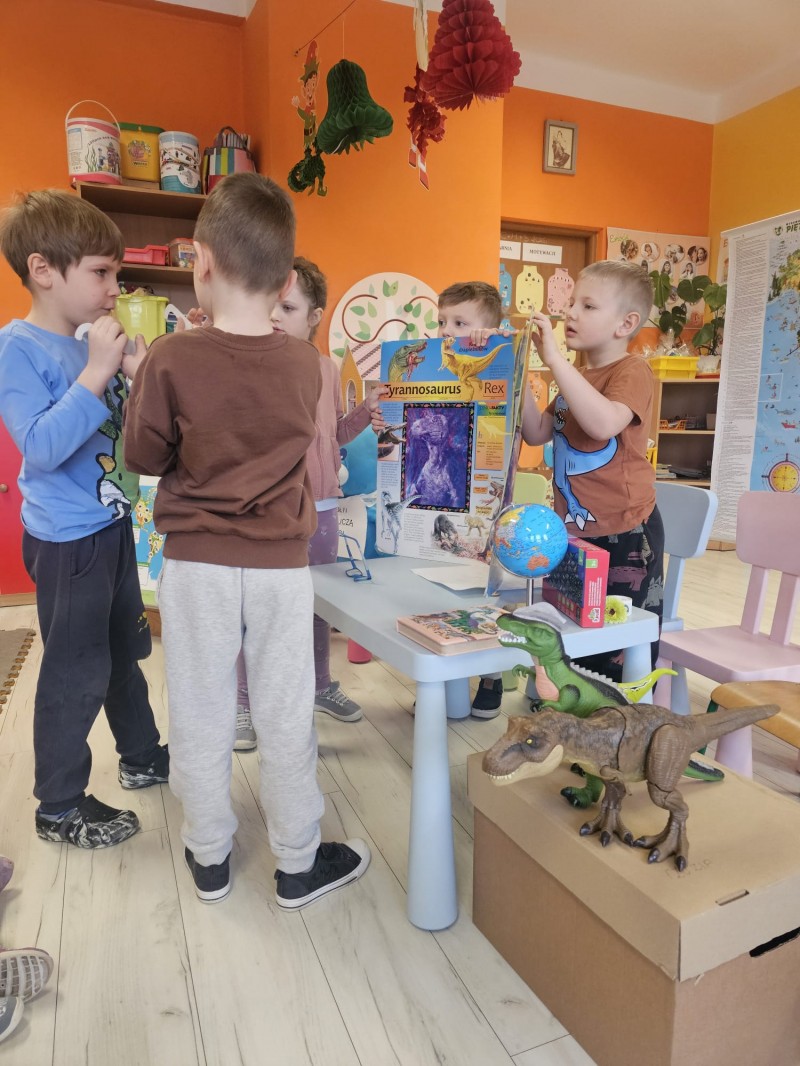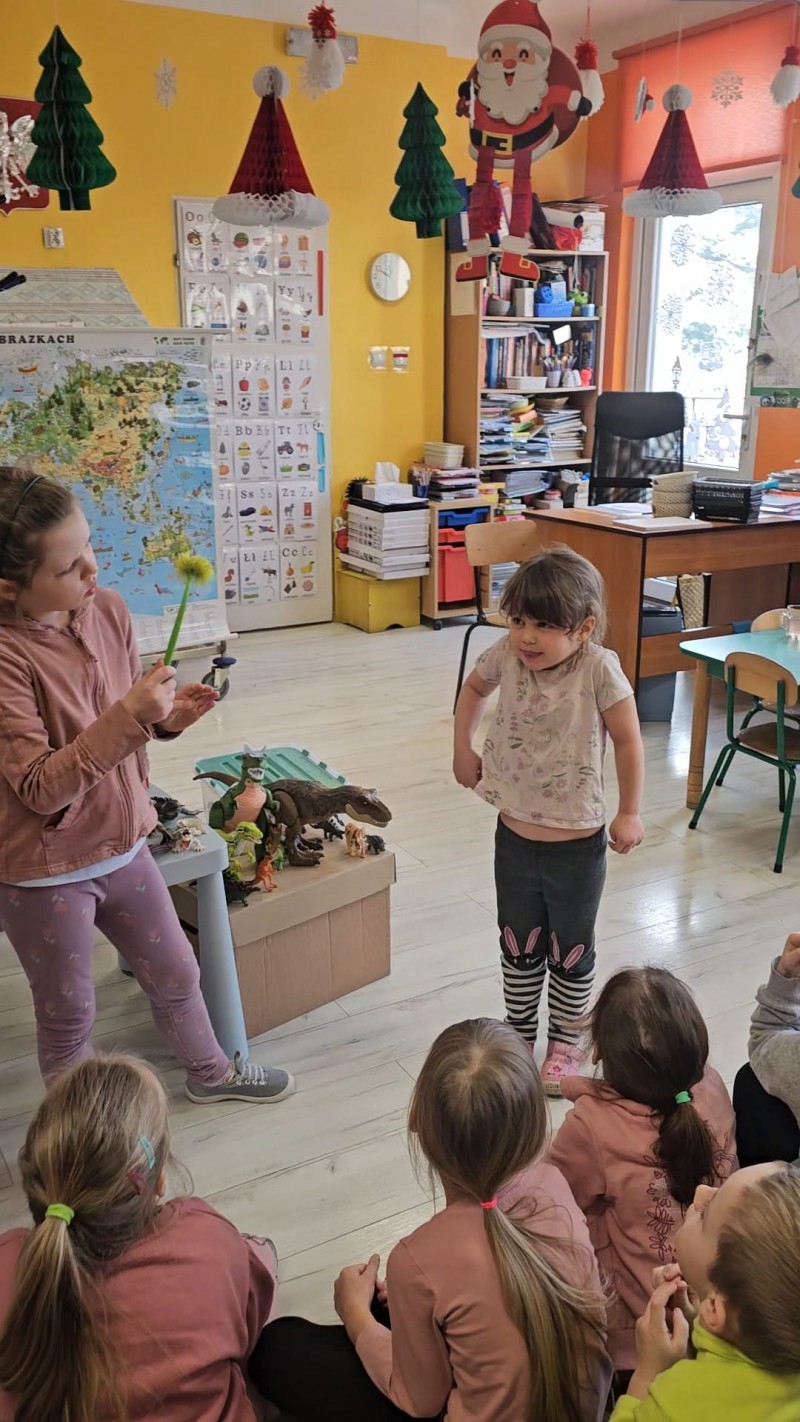 Dzieci same wybrały sobie temat zajęcia, przygotowały scenariusz oraz pomoce dydaktyczne, a potem dla swoich rówieśników prowadziły zajęcia. Z ogromnym zaangażowaniem opowiadały o różnych gatunkach dinozaurów nawiązując do ich życia na Ziemi.Opowiadały również o kontynentach, o tym jak wybuchały wulkany oraz jak zmienił się klimat, kiedy w Ziemię uderzyła ogromna asteroida oraz w jaki sposób wyginęły dinozaury. Nawiązały również do wycieczki, która odbyła się do Muzeum Paleontologicznego w Lisowicach i odkrytych tam dinozaurach.Nic nie umknęło ich uwadze.