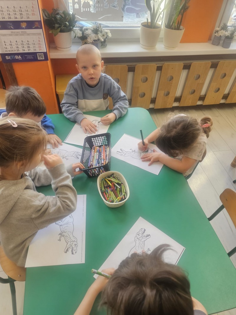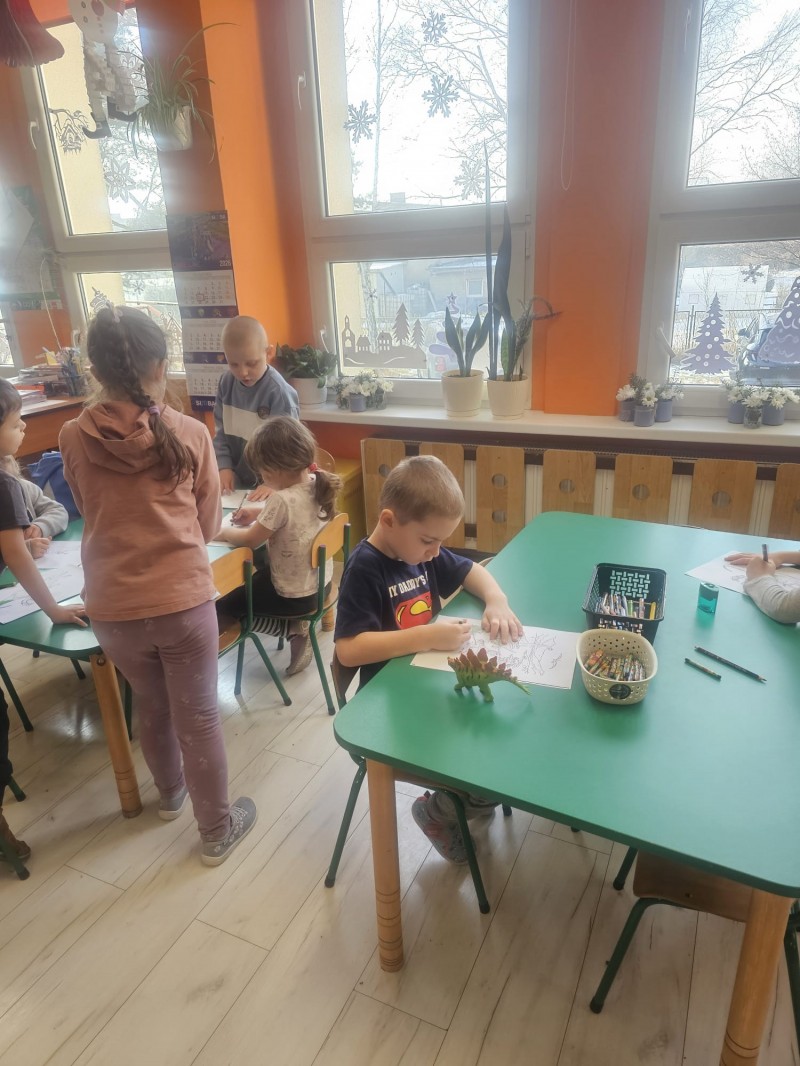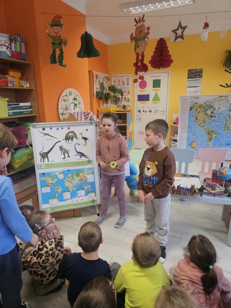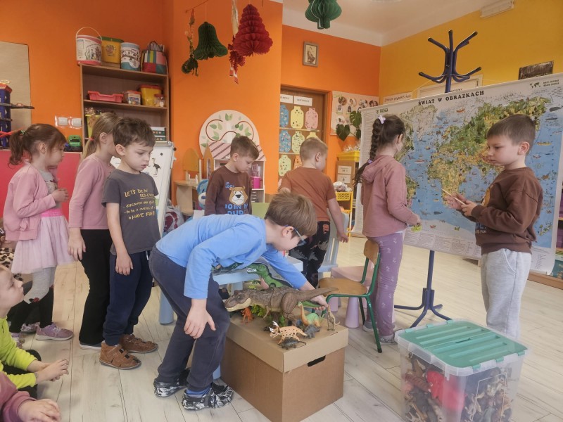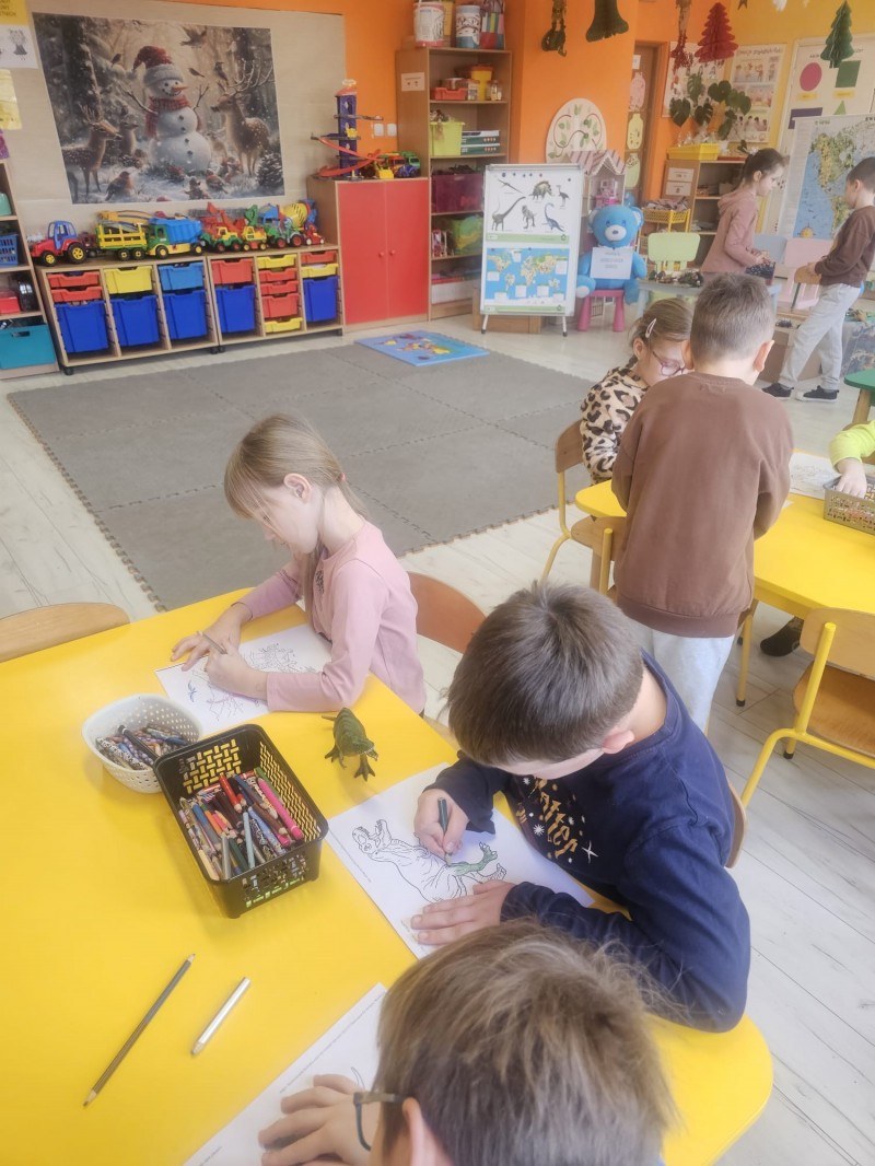 Dzieci same wybrały sobie temat zajęcia, przygotowały scenariusz oraz pomoce dydaktyczne, a potem dla swoich rówieśników prowadziły zajęcia. Z ogromnym zaangażowaniem opowiadały o różnych gatunkach dinozaurów nawiązując do ich życia na Ziemi.Opowiadały również o kontynentach, o tym jak wybuchały wulkany oraz jak zmienił się klimat, kiedy w Ziemię uderzyła ogromna asteroida oraz w jaki sposób wyginęły dinozaury. Nawiązały również do wycieczki, która odbyła się do Muzeum Paleontologicznego w Lisowicach i odkrytych tam dinozaurach.Nic nie umknęło ich uwadze.