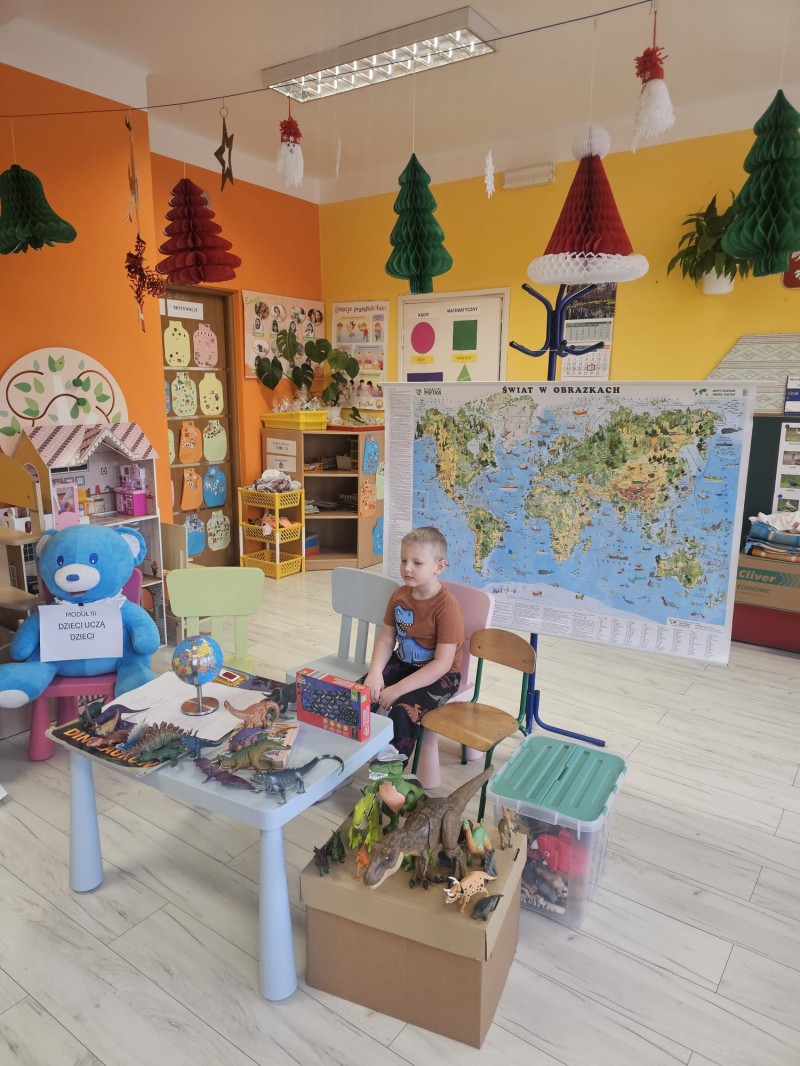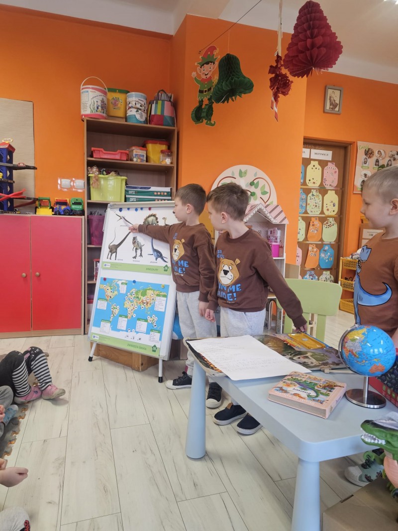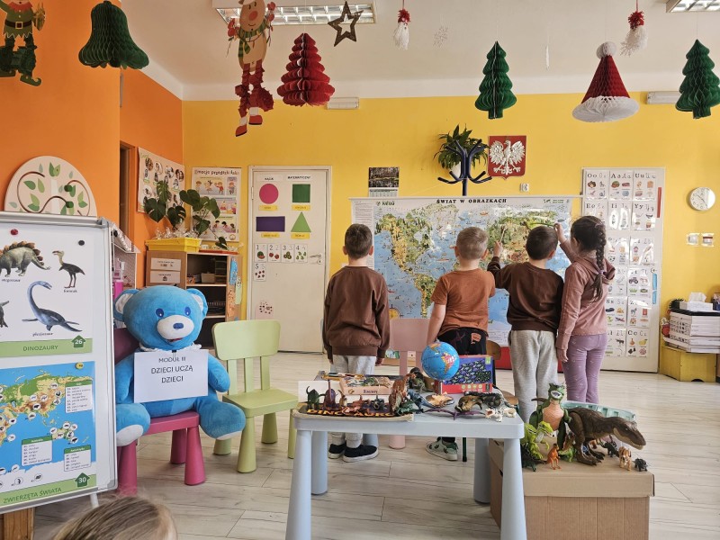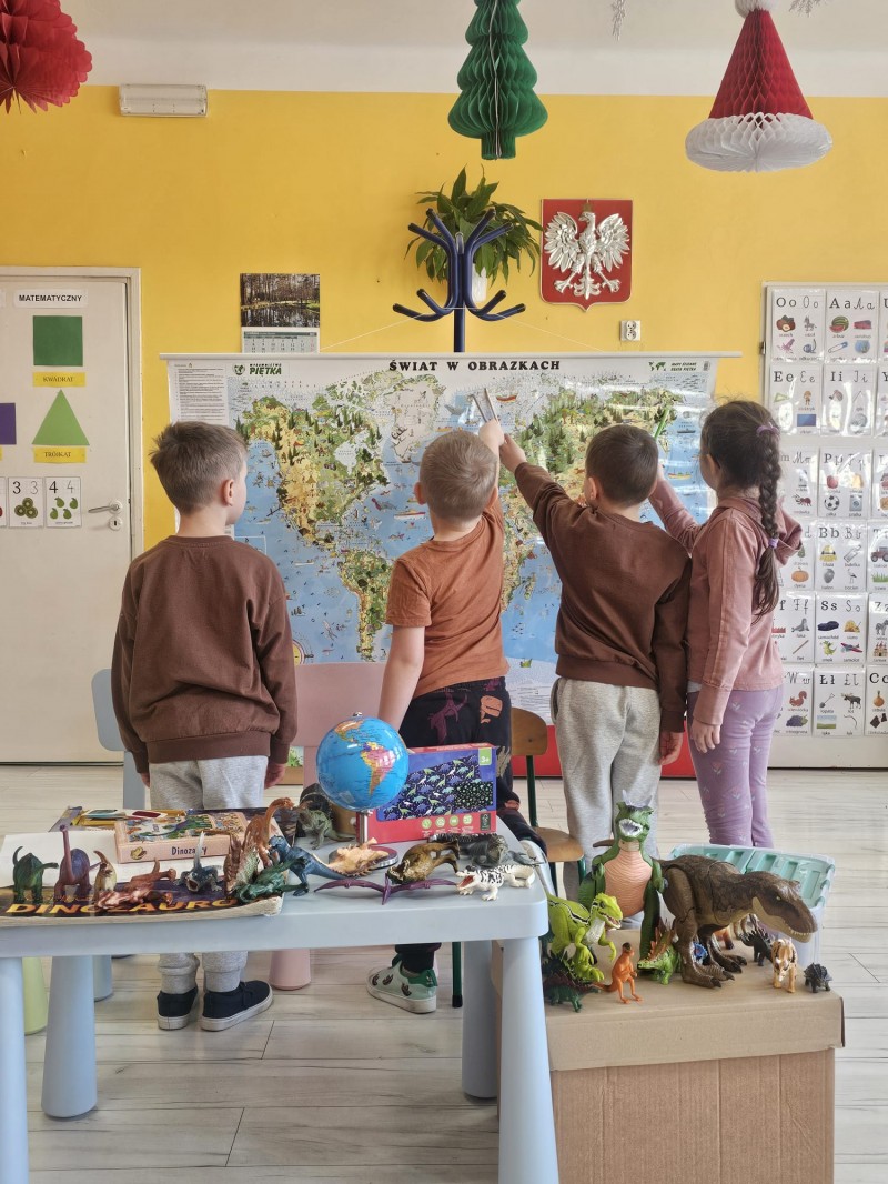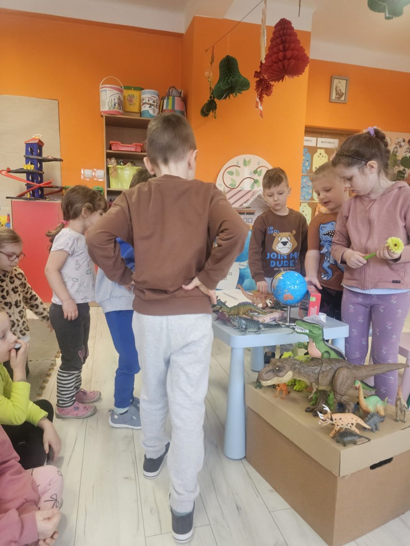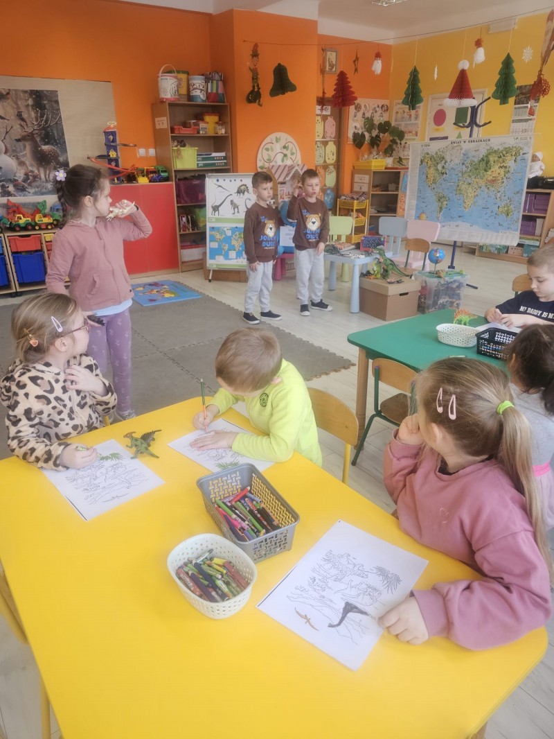 Dzieci same wybrały sobie temat zajęcia, przygotowały scenariusz oraz pomoce dydaktyczne, a potem dla swoich rówieśników prowadziły zajęcia. Z ogromnym zaangażowaniem opowiadały o różnych gatunkach dinozaurów nawiązując do ich życia na Ziemi.Opowiadały również o kontynentach, o tym jak wybuchały wulkany oraz jak zmienił się klimat, kiedy w Ziemię uderzyła ogromna asteroida oraz w jaki sposób wyginęły dinozaury. Nawiązały również do wycieczki, która odbyła się do Muzeum Paleontologicznego w Lisowicach i odkrytych tam dinozaurach.Nic nie umknęło ich uwadze.