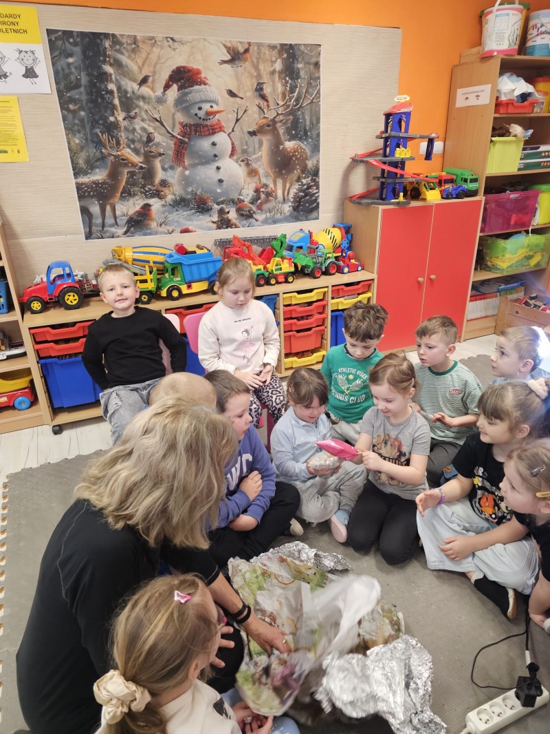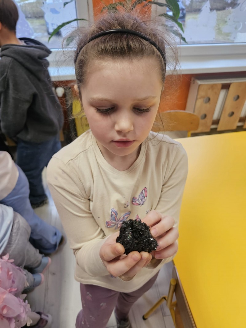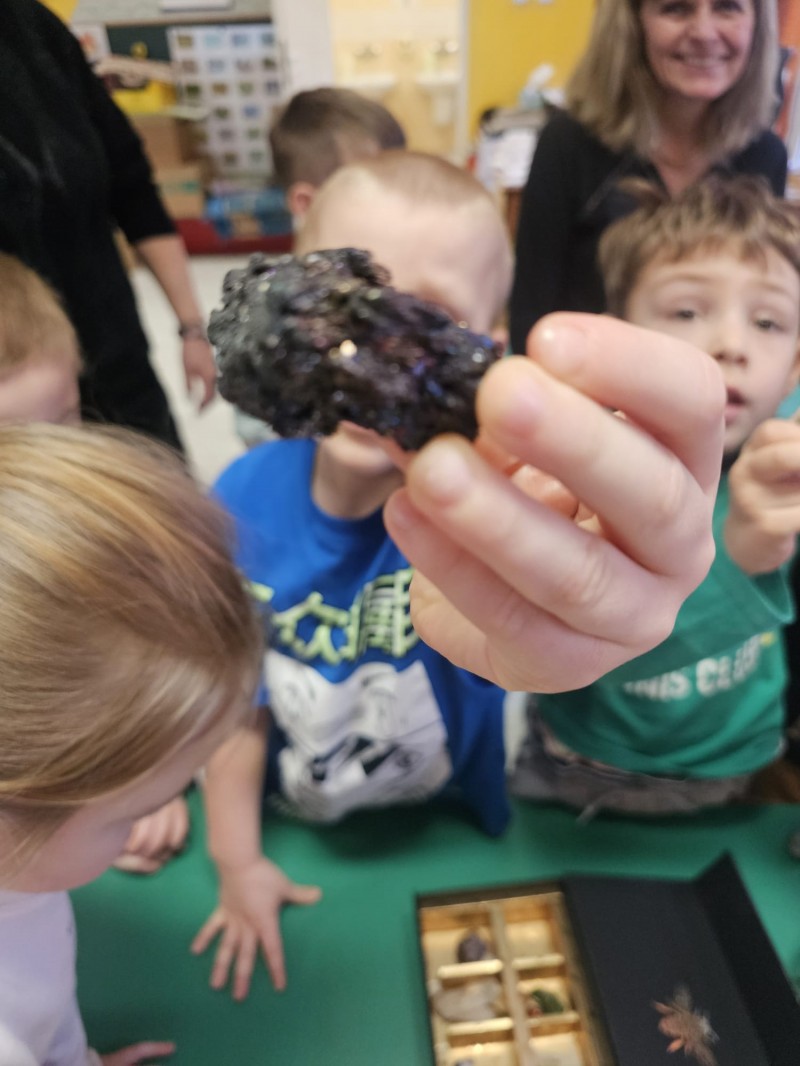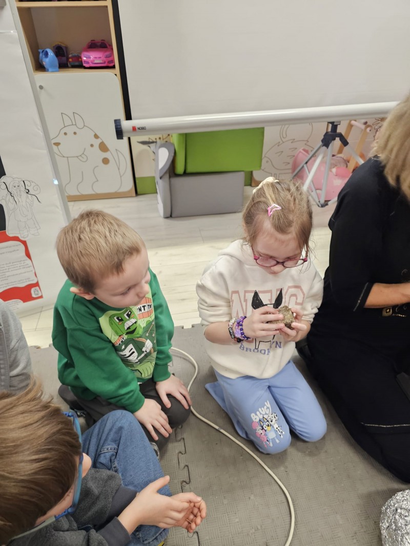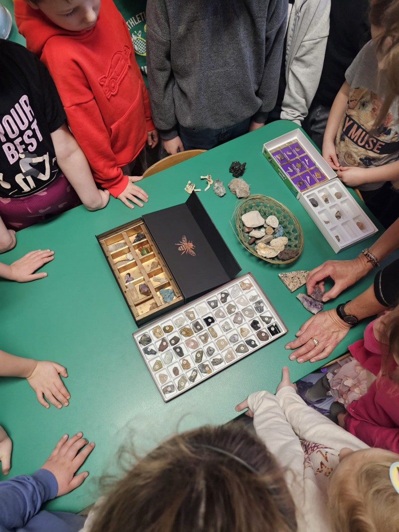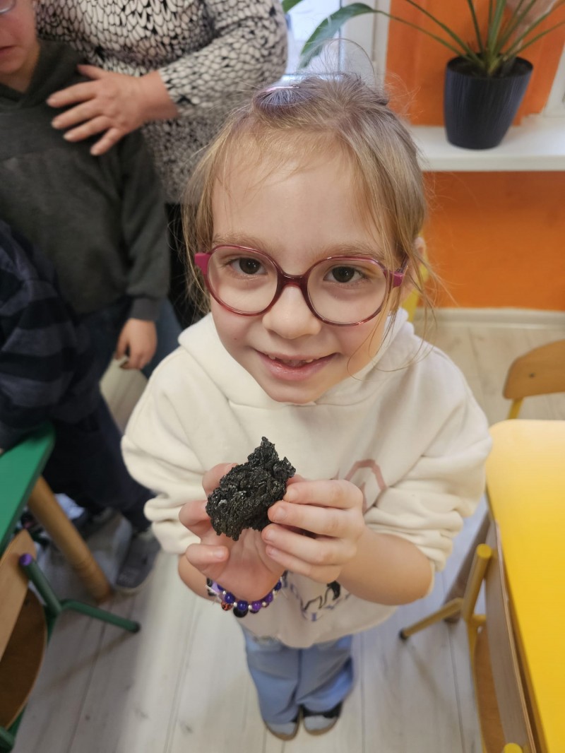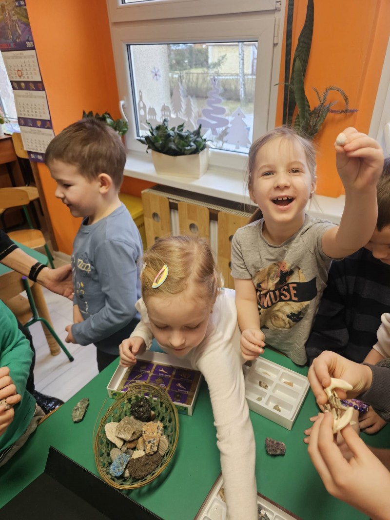 Podczas spotkania omówiono także kamienie szlachetne, kruszce oraz inne surowce, które wydobywa się w kopalniach na całym świecie. Dzieci z ogromnym zainteresowaniem słuchały opowieści, zadawały pytania i aktywnie uczestniczyły w rozmowie.