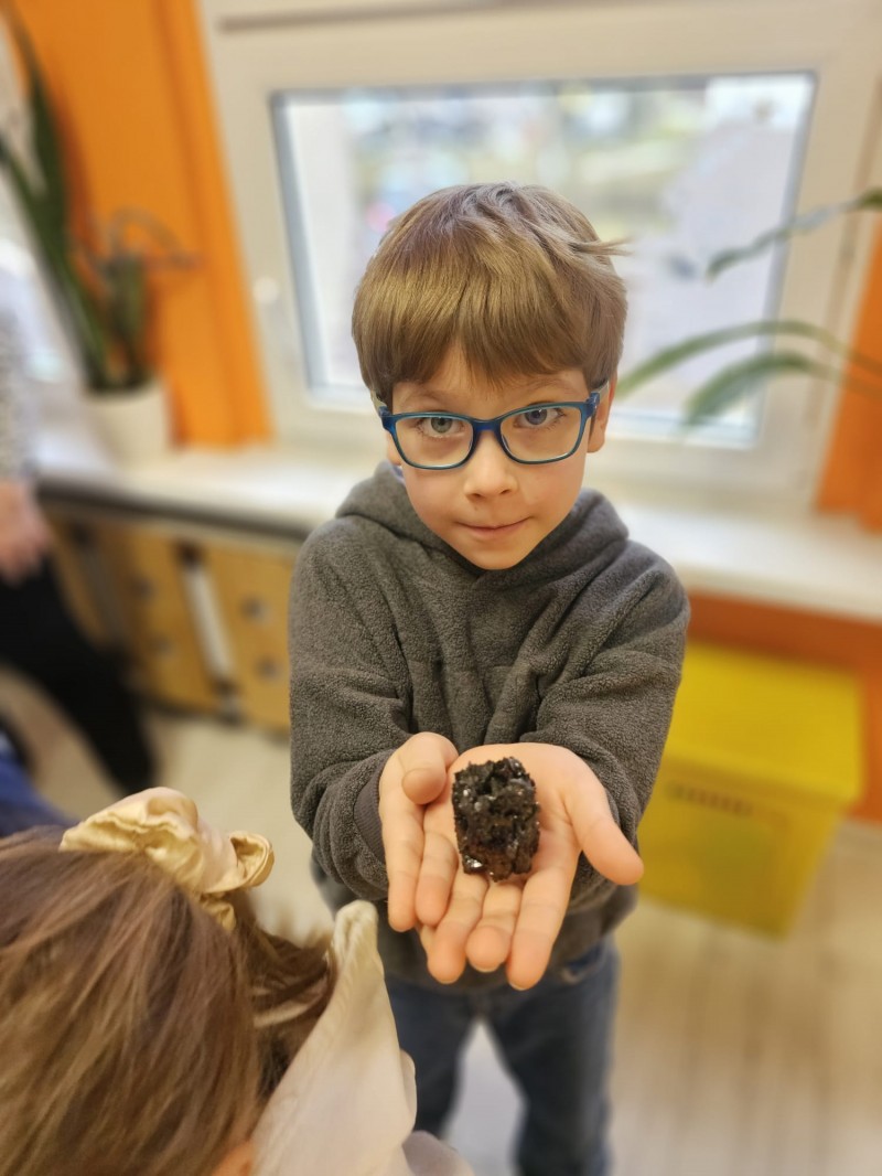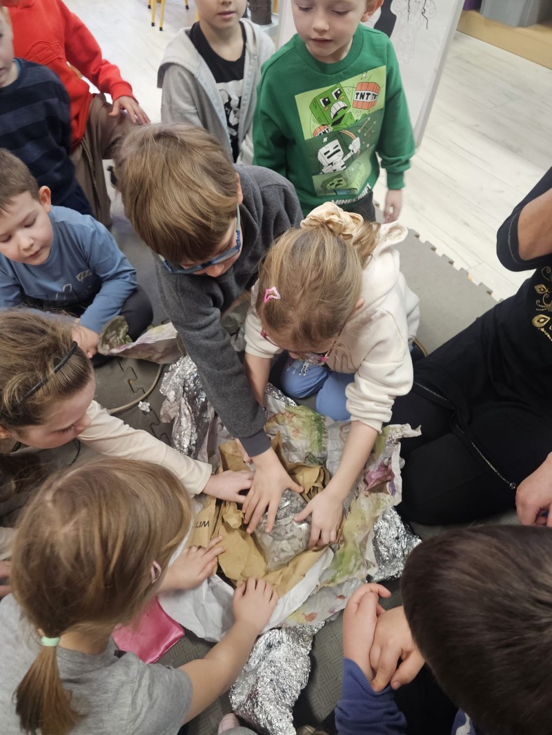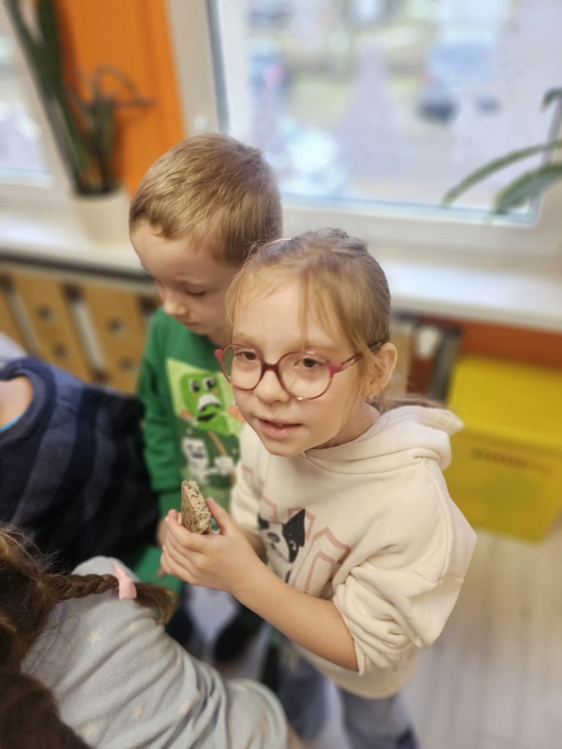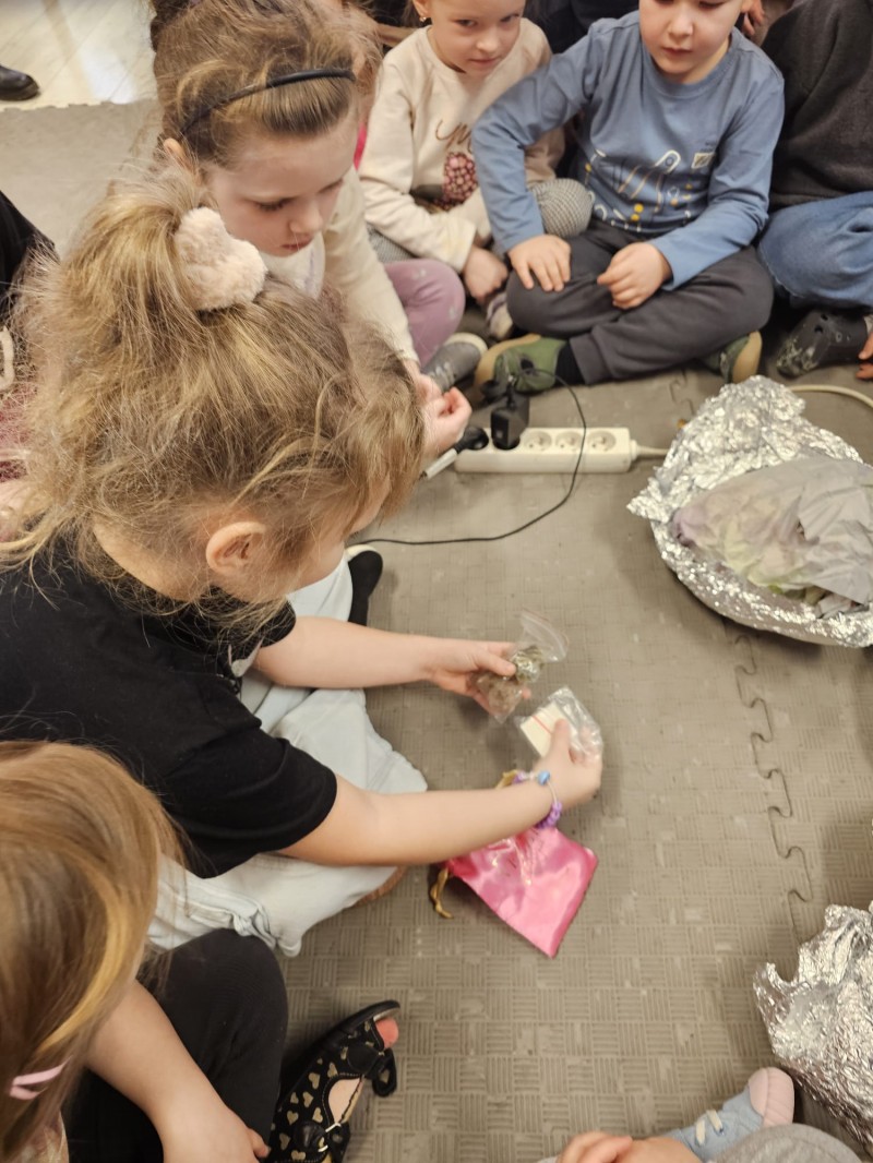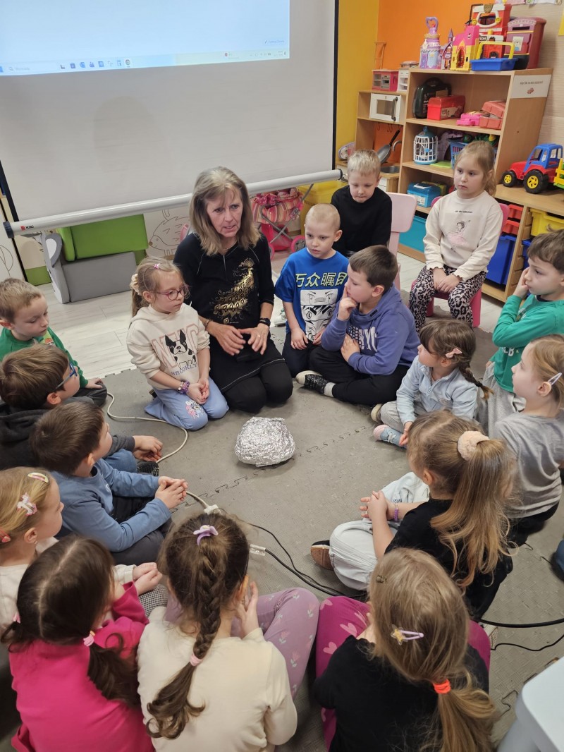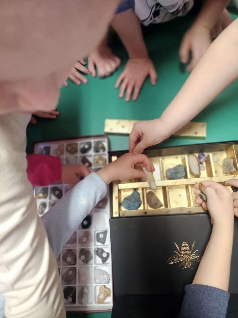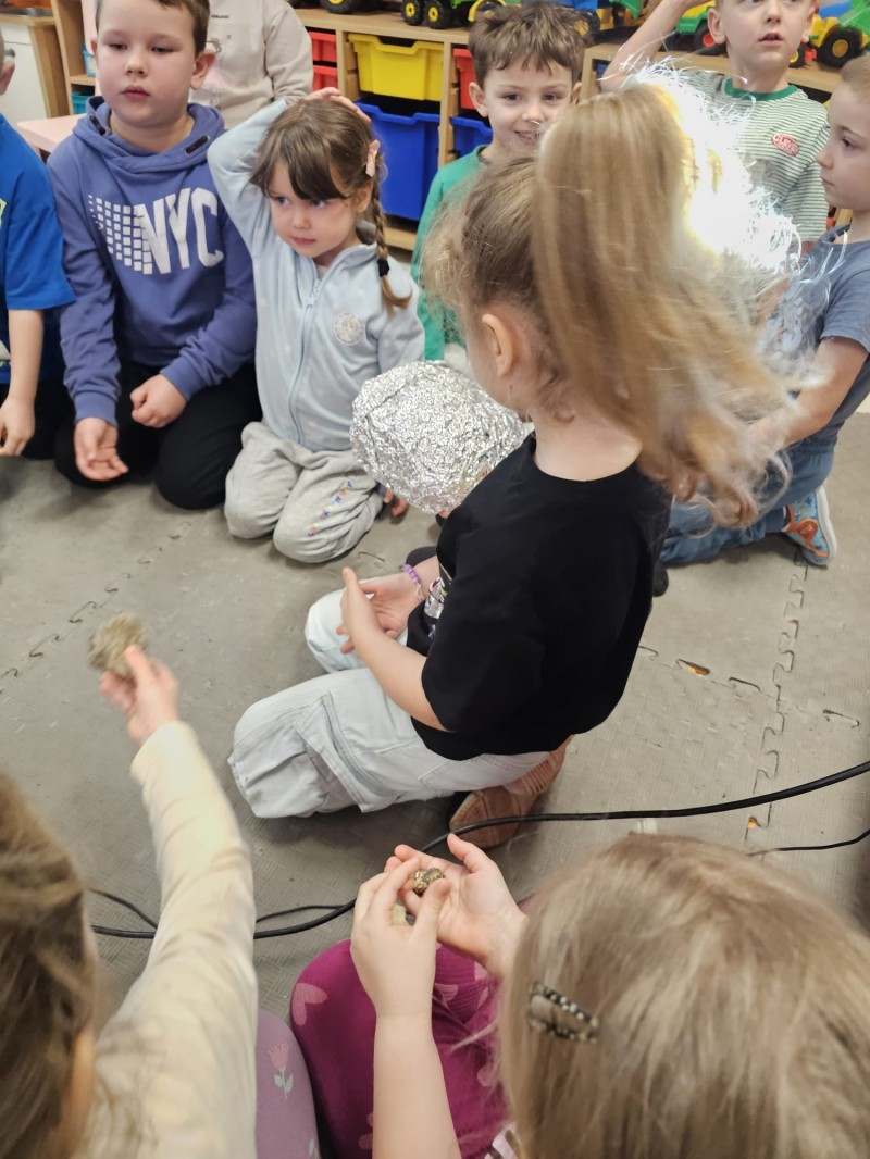 Podczas spotkania omówiono także kamienie szlachetne, kruszce oraz inne surowce, które wydobywa się w kopalniach na całym świecie. Dzieci z ogromnym zainteresowaniem słuchały opowieści, zadawały pytania i aktywnie uczestniczyły w rozmowie.