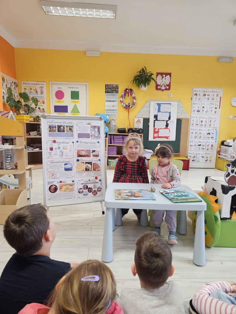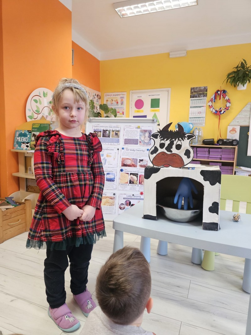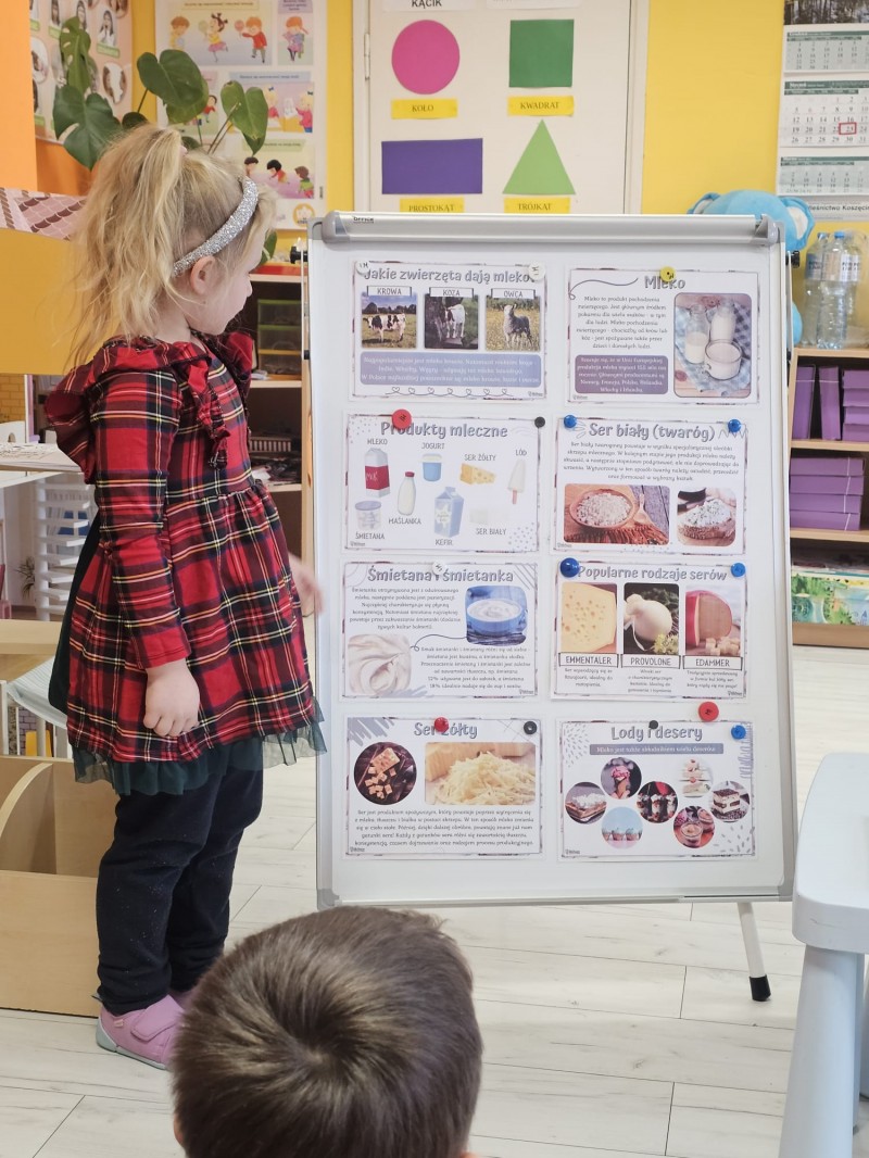 Milenka wcieliła się dziś w rolę małej nauczycielki i z ogromnym zaangażowaniem poprowadziła zajęcie dla swoich rówieśników z grupy Motylków na temat „Mleko jest zdrowe” .