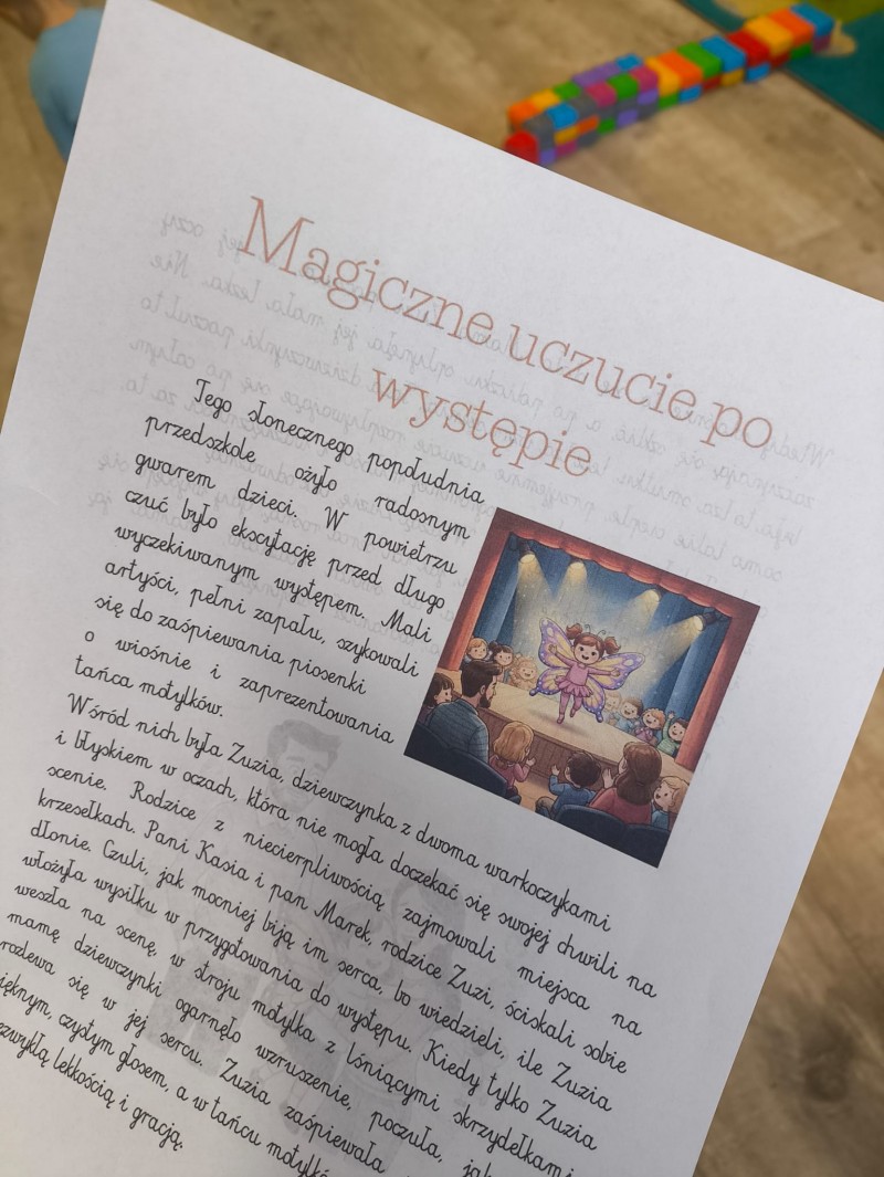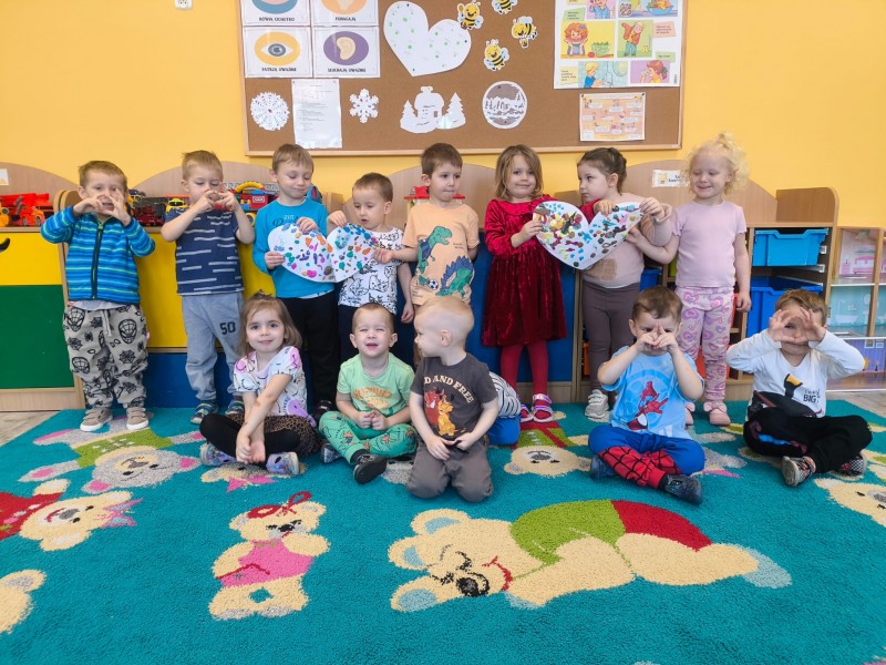 Pszczółki wysłuchały kolejnej bajki terapeutycznej pt. "Magiczne uczucie po występie". Celem zajęć było pomóc dzieciom w rozpoznawaniu i rozumieniu emocji wzruszenia u siebie i u innych, pokazując ją jako pozytywny wyraz miłości, dumy i radości, a także wzmacnianie poczucia bycia kochanym i docenianym. Na koniec wspólnie wykonaliśmy "Serca wzruszeń".
